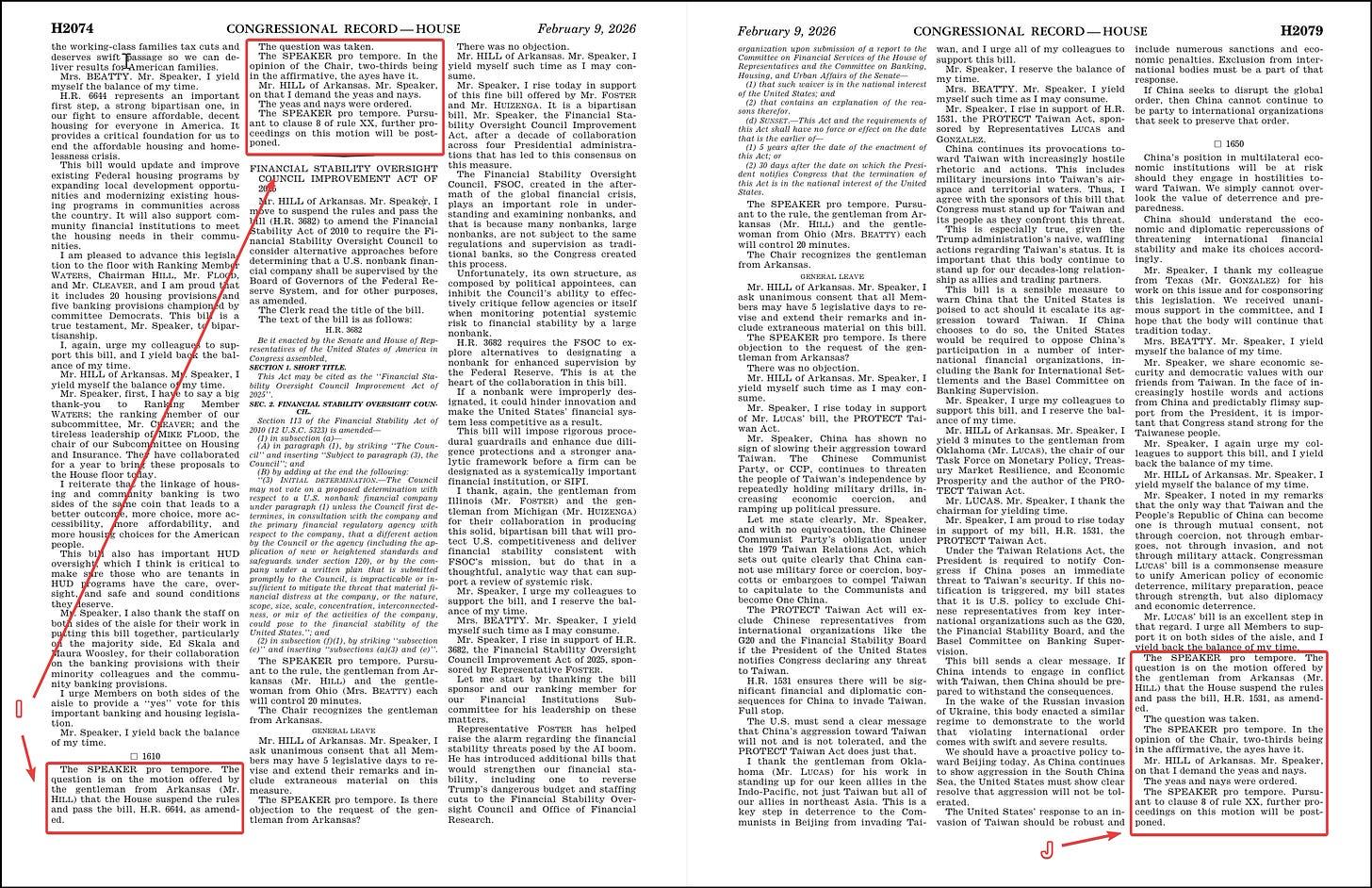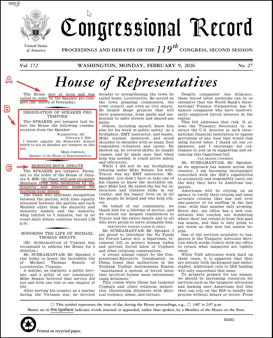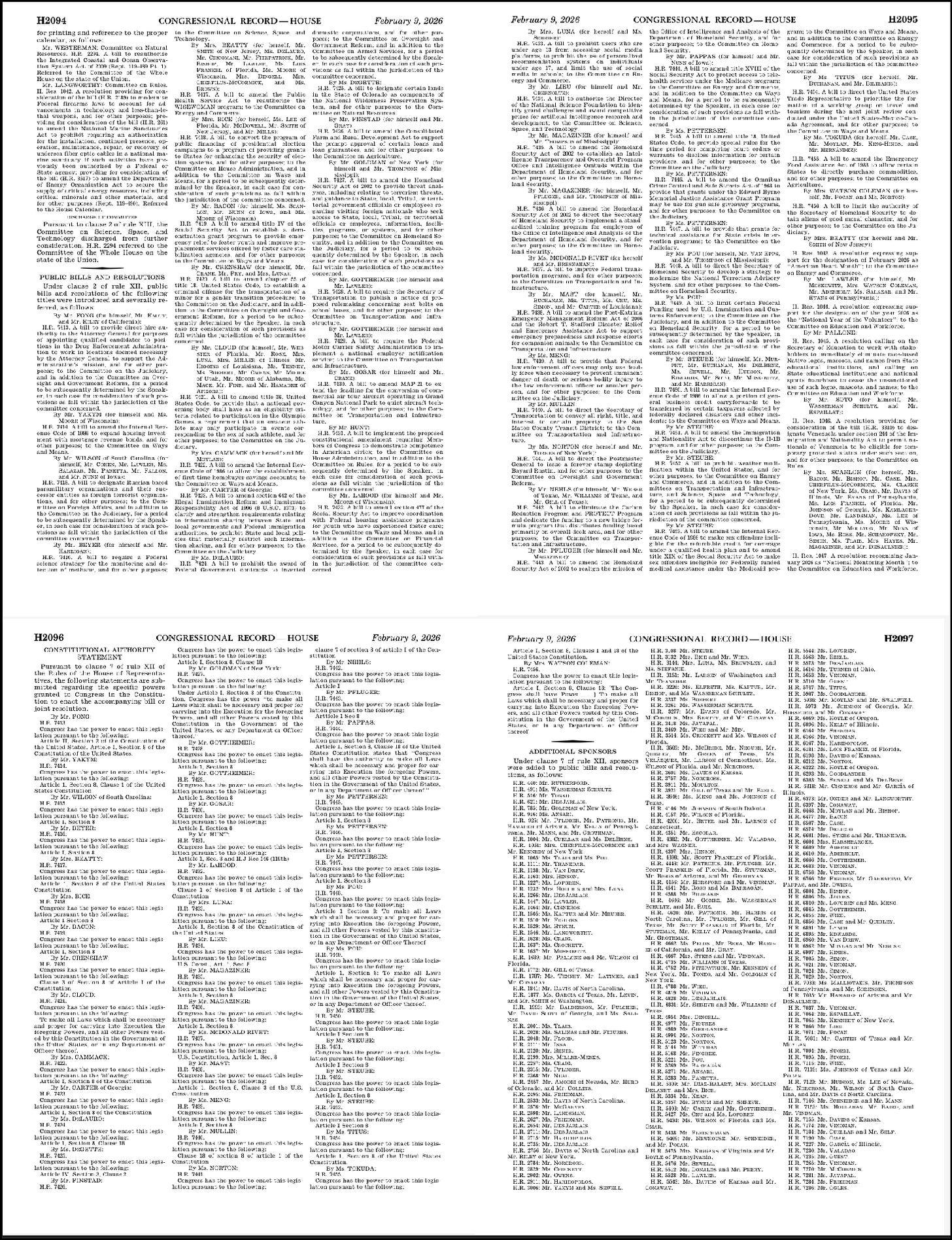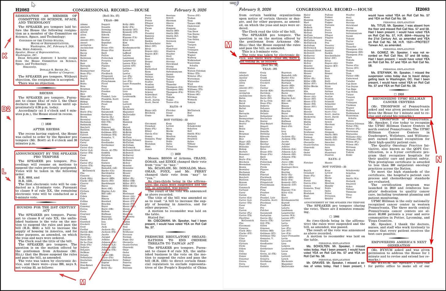 Let’s start. It’s the morning of February 10, 2026. You crack open yesterday’s congressional record and turn to the proceedings of the House. We can walk through it, letter by letter.